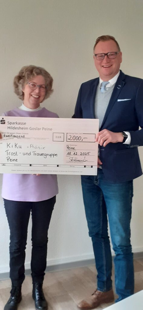 Ein ganz besonderes „Weihnachtsgeschenk“ erhielten wir am Donnerstag, den 18.12.2025. Her Schönaich, der Schulleiter der Burgschule, überreicht unser Frau Ritter aus dem Vorstand einen Scheck über 2000€ aus dem diesjährigen Weihnachtsbaumverkauf für unsere Kinder- und Jugendtrauerarbeit. Wir freuen uns riesig über diese Spende und danken allen Mitwirkenden für dieser überragende Aktion!!!