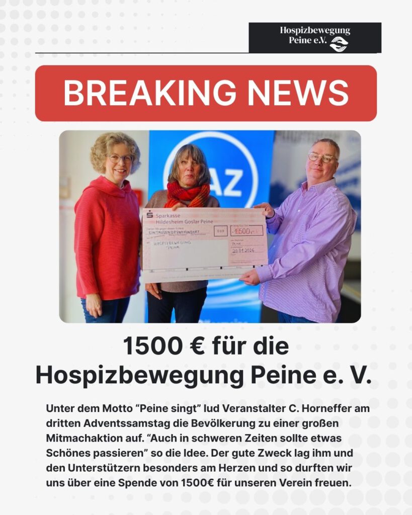 - Was war so los…Auch in den letzten Monaten ist es nicht still und tatenlos in der Hospizbewegung Peine geblieben.Im April durften wir, im Rahmen unseres 30-jährigen Vereinsjubiläumsprogramms, einen Vortrag über „Kinder begegnen Abschied und Trauer in der Literatur … Weiterlesen: Was war so los…